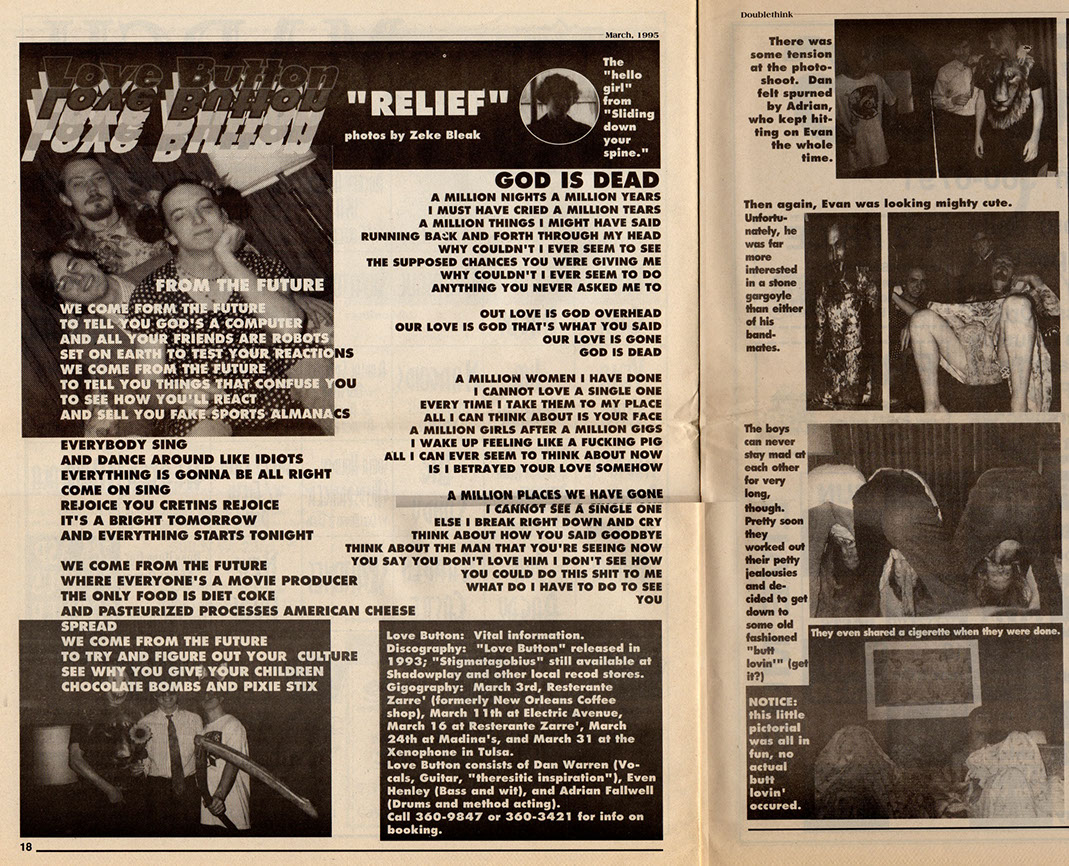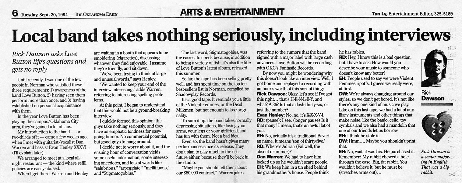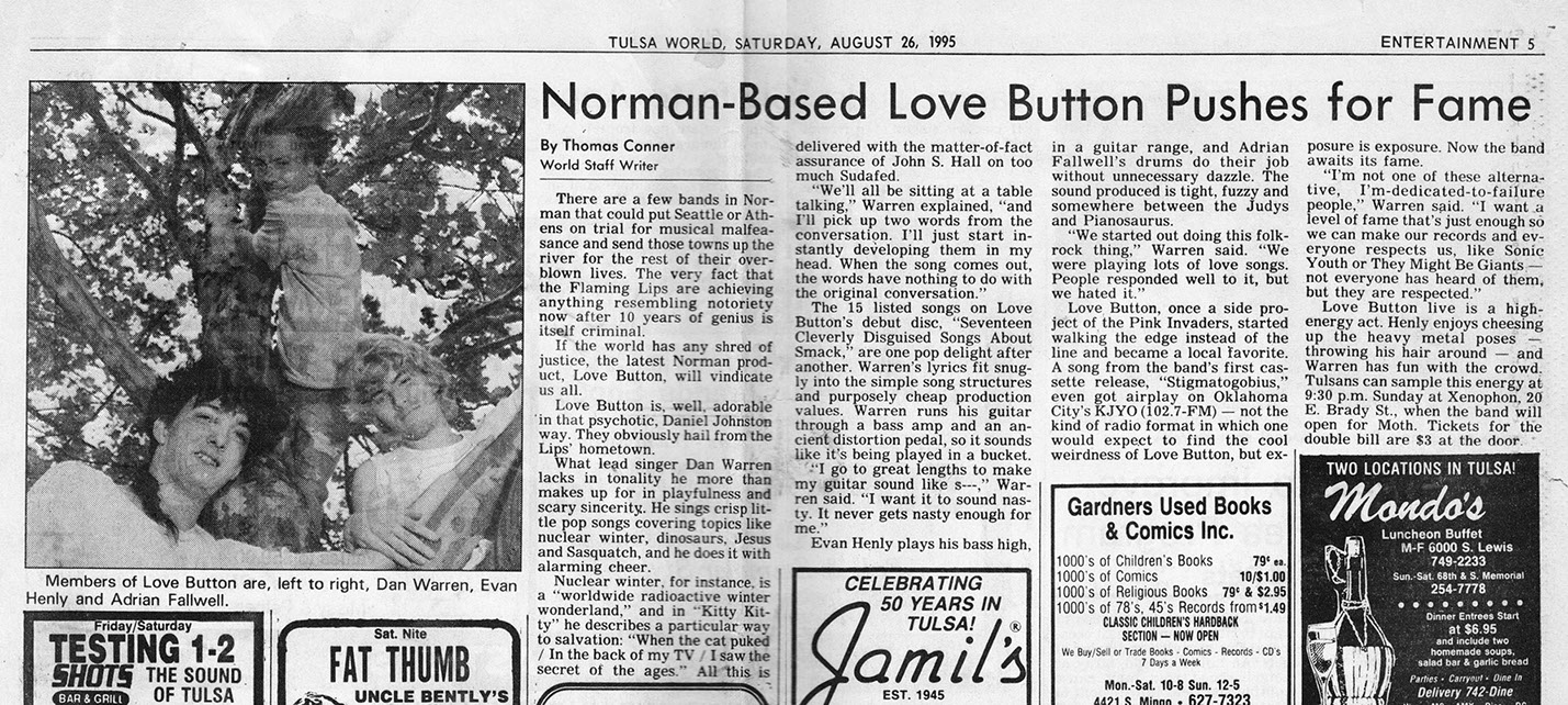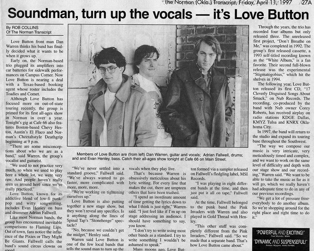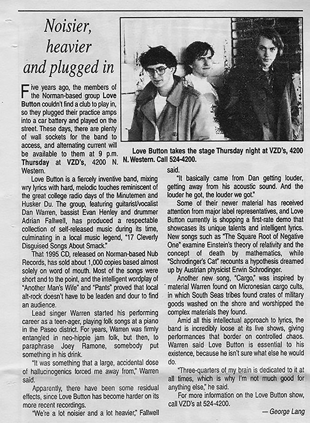 Love Button formed in Oklahoma City in May of 1992. The three-piece featuring Dan Warren, Evan Henley and Adrian Fallwell, played a "Violent Femmes style" folk-punk, punctuated by Dan Warren's clever lyrics. In the beginning, the band often performed on the streets of Deep Ellum in Dallas, Bricktown in OKC and Campus Corner in Norman, OK. The bass and vocals were ran through a small amplifier, powered by a car battery.